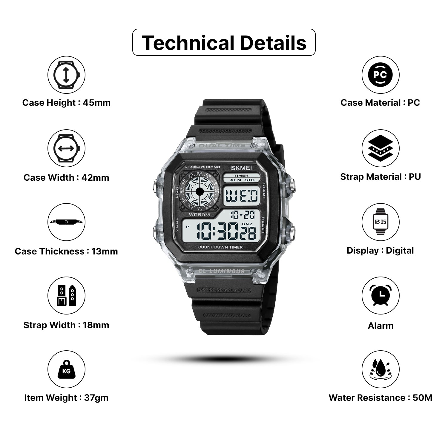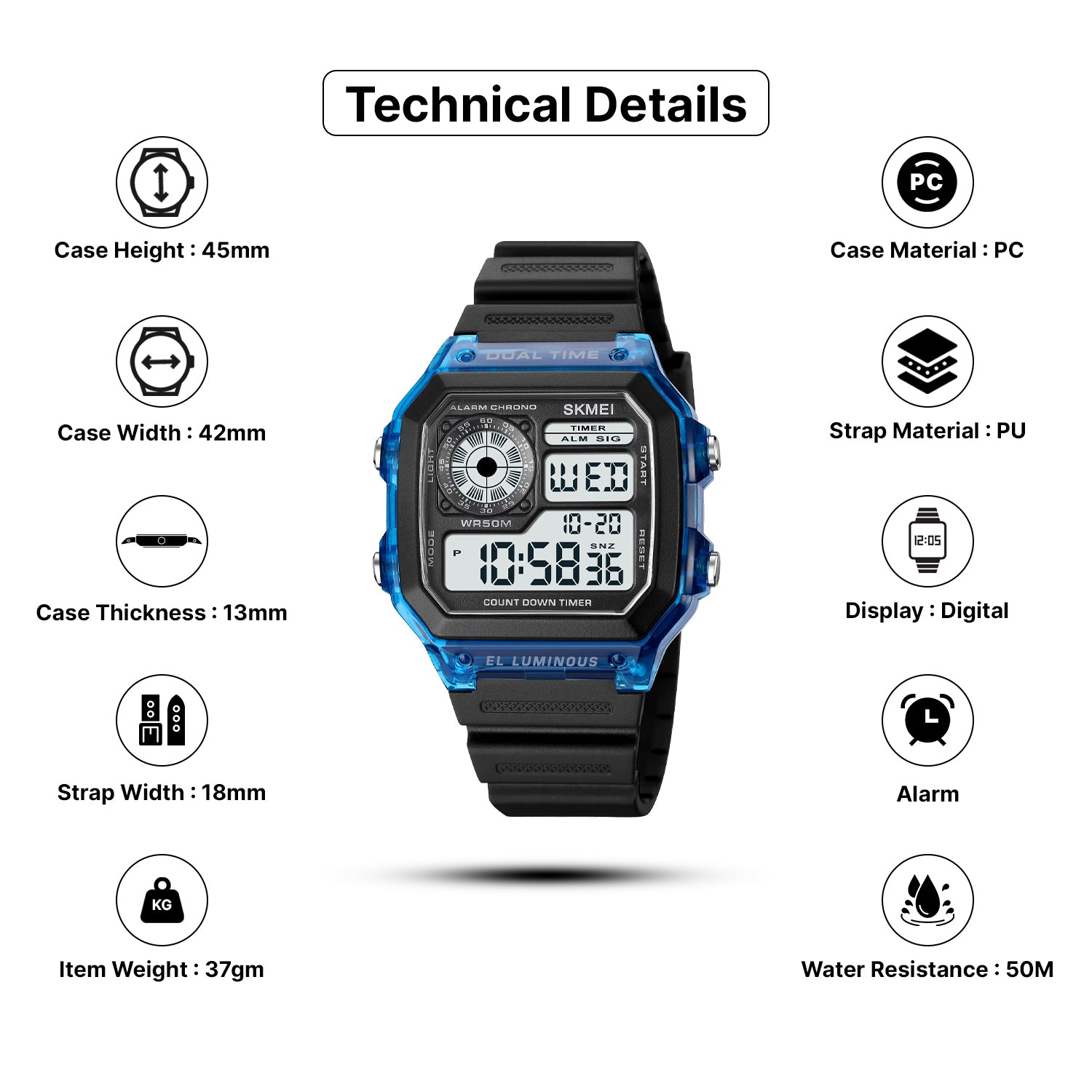 This lightweight and durable watch by SKMEI is ideal for everyday wear and sports activities. Featuring 50M water resistance, a PC case, and PU band, it ensures long-lasting durability. Its easy-to-read display with EL light includes dual time, chronograph, alarm, date and week display, 12/24-hour format, and a countdown timer, making it a reliable and practical timepiece.