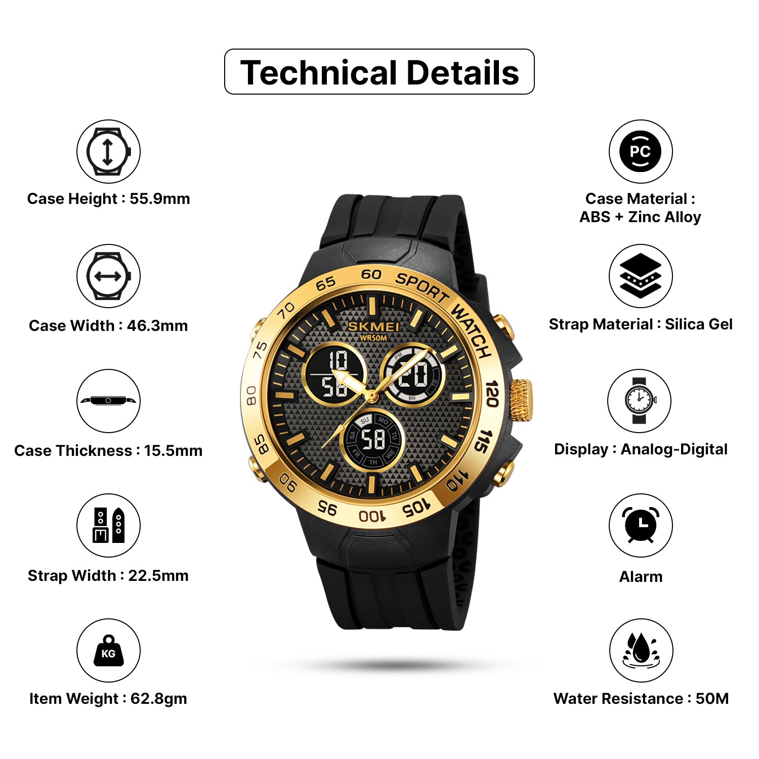 This SKMEI watch features a zinc alloy case and sturdy ABS construction with 50M water resistance and an EL backlight. It includes 3 time zones, chronograph, alarm, countdown timer, and a 12/24-hour clock, paired with a silica gel strap and stainless-steel buckle for durability and comfort.
