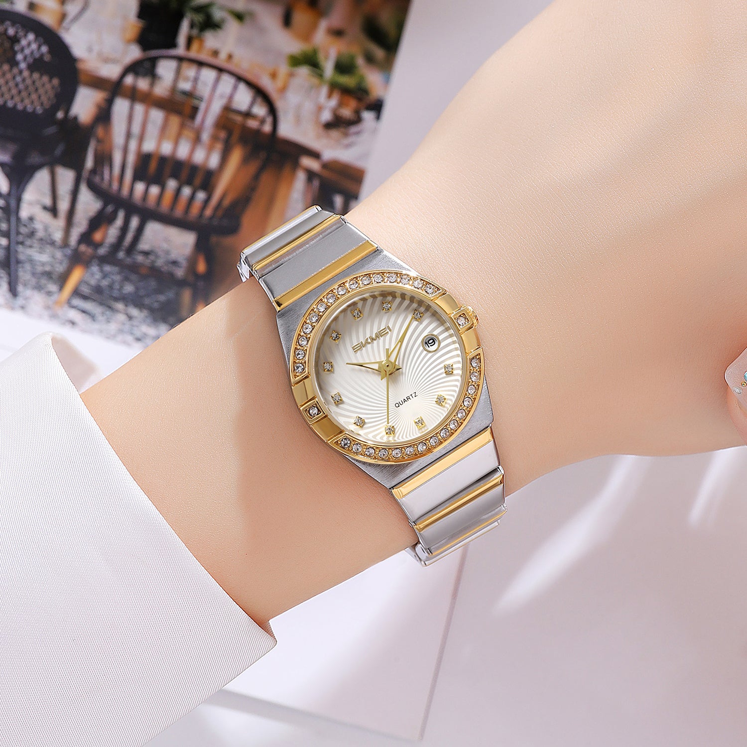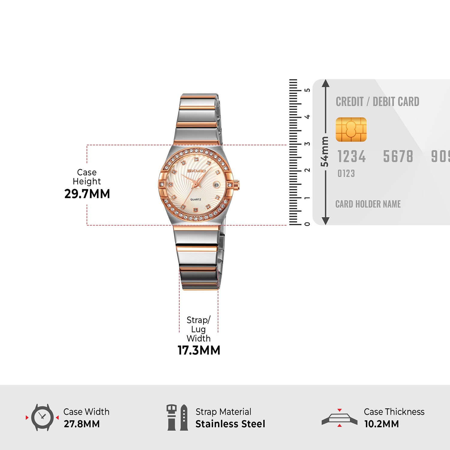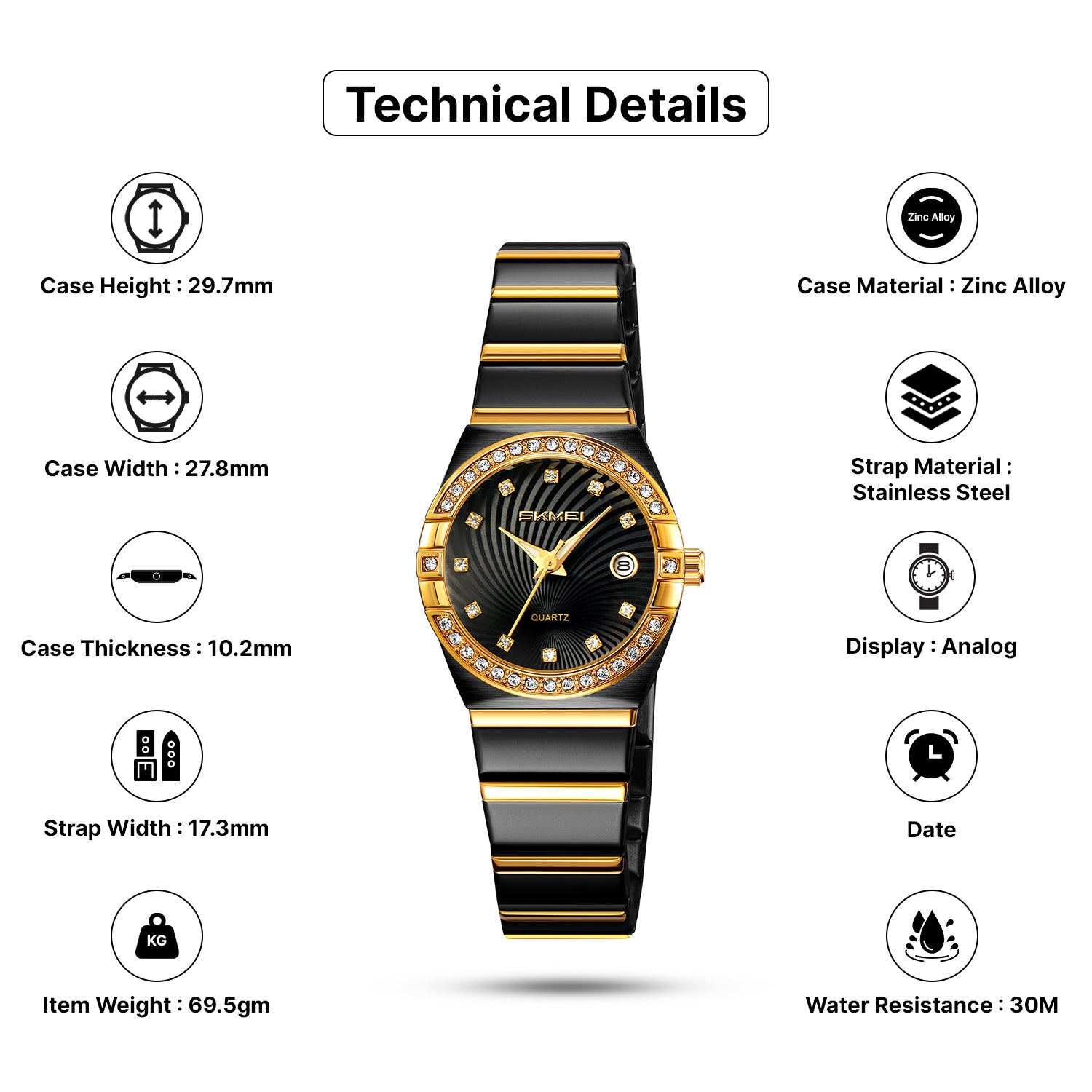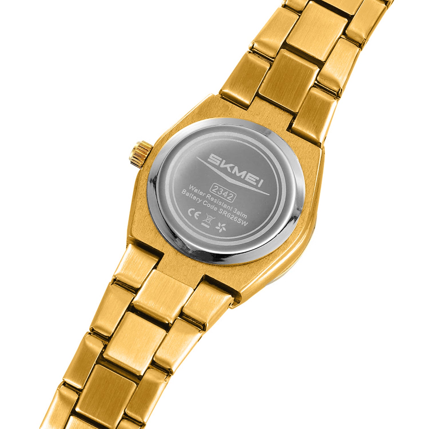 Timeless Elegance with SKMEI Womens Analog Quartz Watch 2342 Elevate your fashion statement with the SKMEI Quartz Womens Watch (Model: 2342) a stunning combination of luxury, precision, and durability . Whether youre heading to a business meeting, a casual brunch, or a glamorous evening event, this watch adds a touch of sophistication to any look. Sleek & Sophisticated Design Featuring a sparkling crystal-embellished dial and a polished stainless steel band, this watch is a perfect blend of fashion and functionality . Built for Everyday Wear Made with a durable zinc alloy case , a scratch-resistant glass , and a stainless steel band , ensuring both comfort and longevity. Water-Resistant (30M) Resistant to splashes and minor water exposure, making it suitable for everyday activities. Precision Timekeeping With a quartz movement and a reliable SR626SW battery , youll always stay on schedule. A Thoughtful Gift for Every Occasion Whether for yourself or a loved one, the SKMEI 2342 is the perfect gift for women who appreciate timeless elegance. Upgrade your accessories collection with the SKMEI Quartz Womens Watch a statement piece designed to complement every outfit!