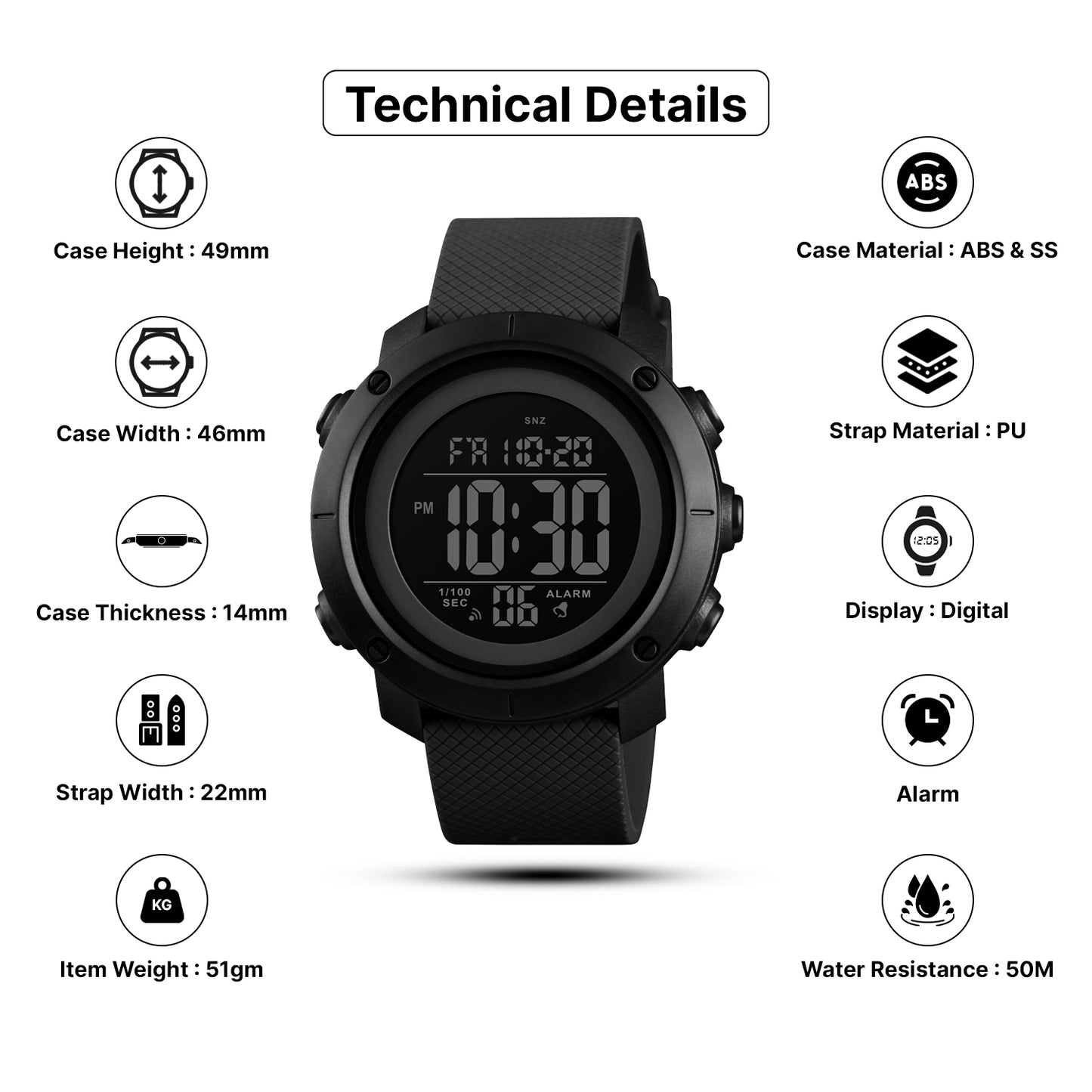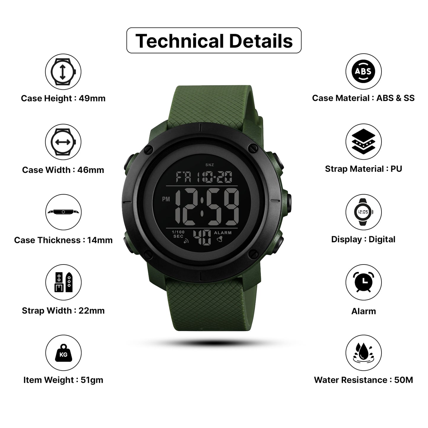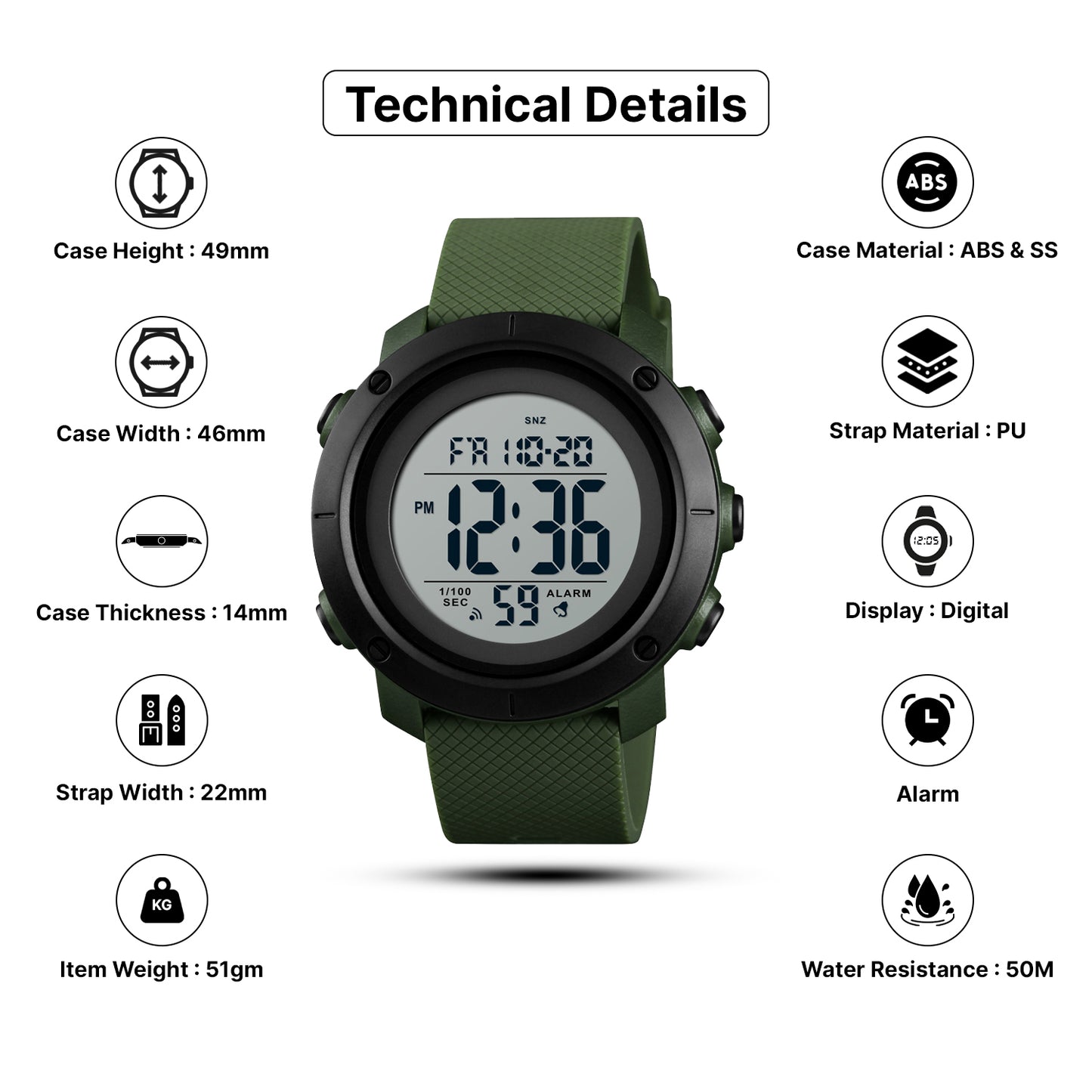 This sleek SKMEI watch features a round resin case and durable band, offering 12/24-hour format, alarm, chronograph, and date/day display. Water-resistant and equipped with a secure buckle clasp, its perfect for both everyday wear and active lifestyles.