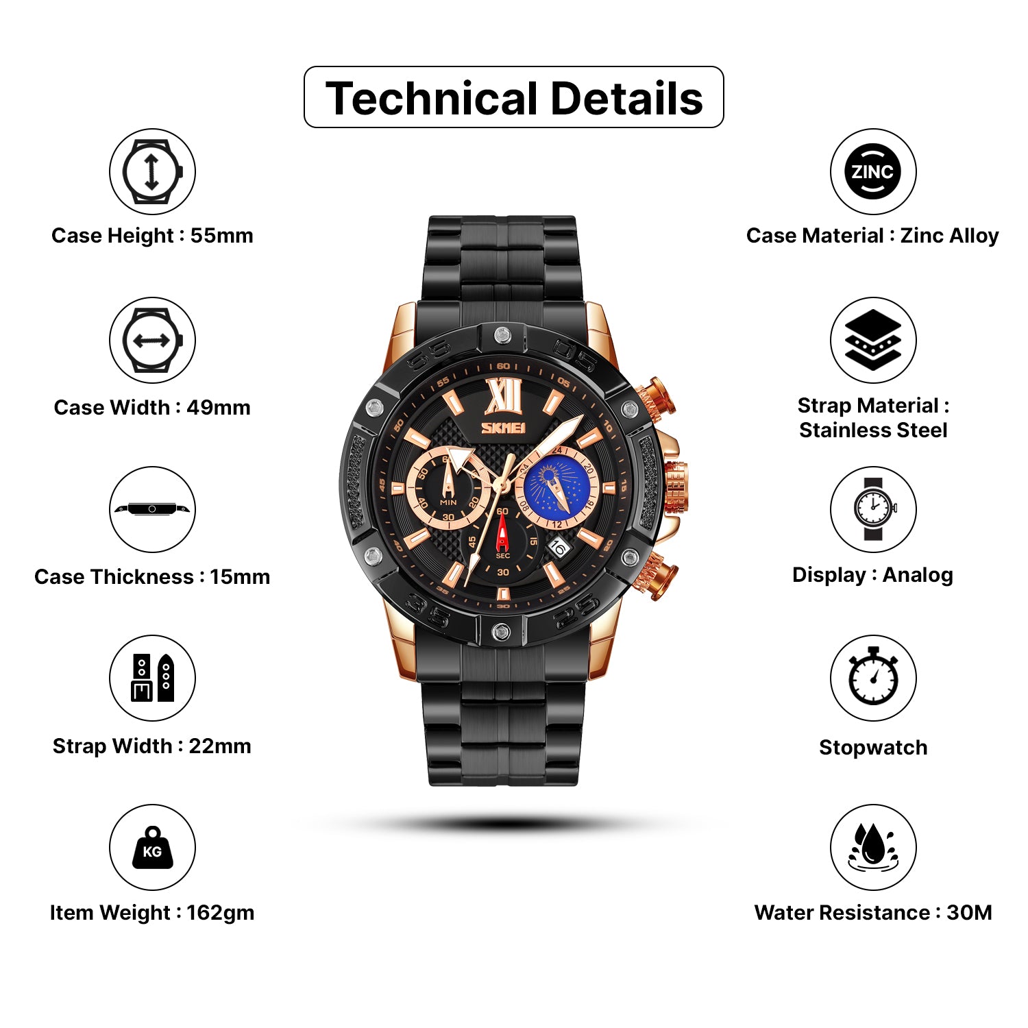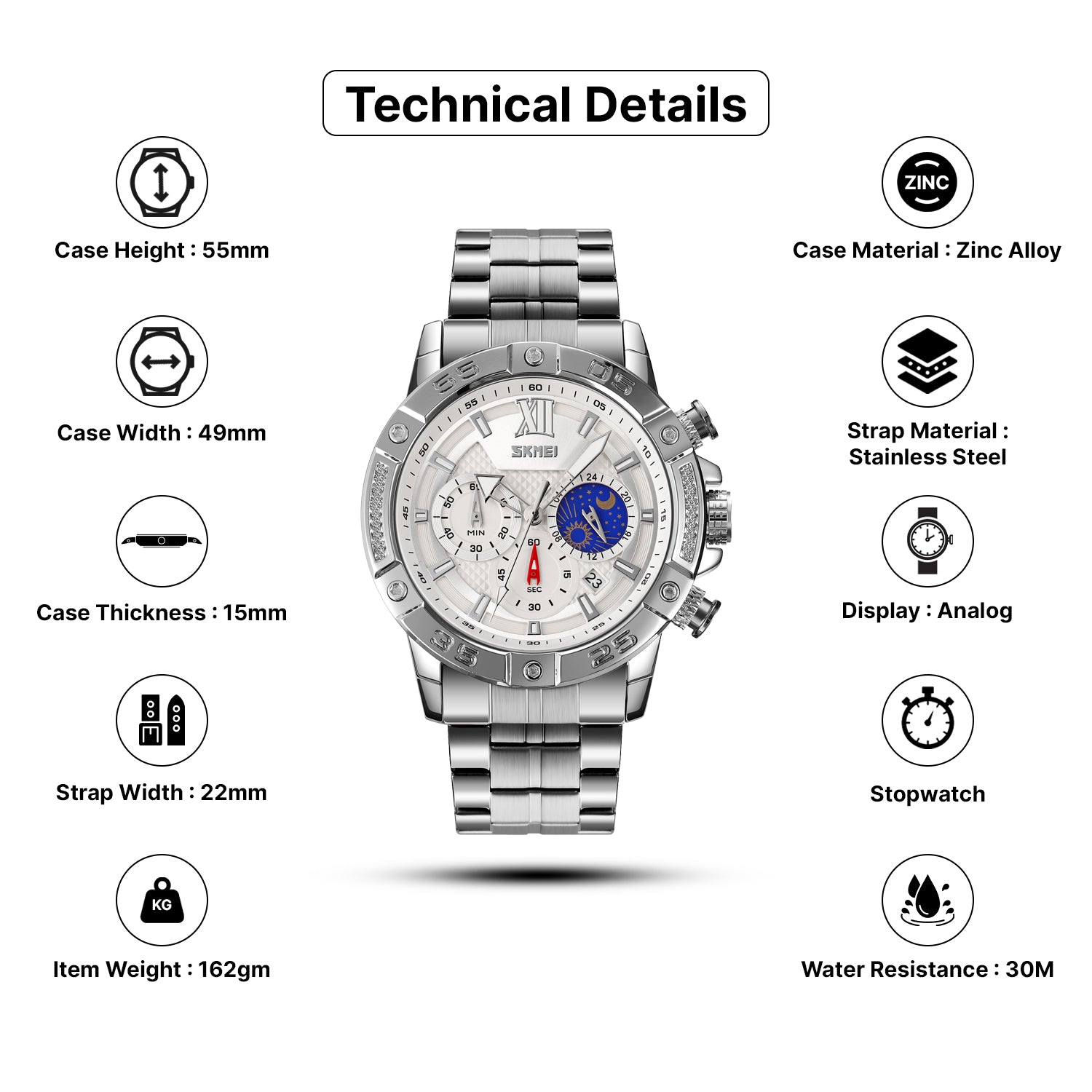 The SKMEI mens quartz watch is designed to add poise and refinement to everyday attire. It features a 49mm zinc alloy case, glass dial window, stainless-steel band (black & silver), and displays time, date, stopwatch, and moon phase. With 30M water resistance and weighing 162g, it offers a perfect fit and a touch of luxury for any wrist.