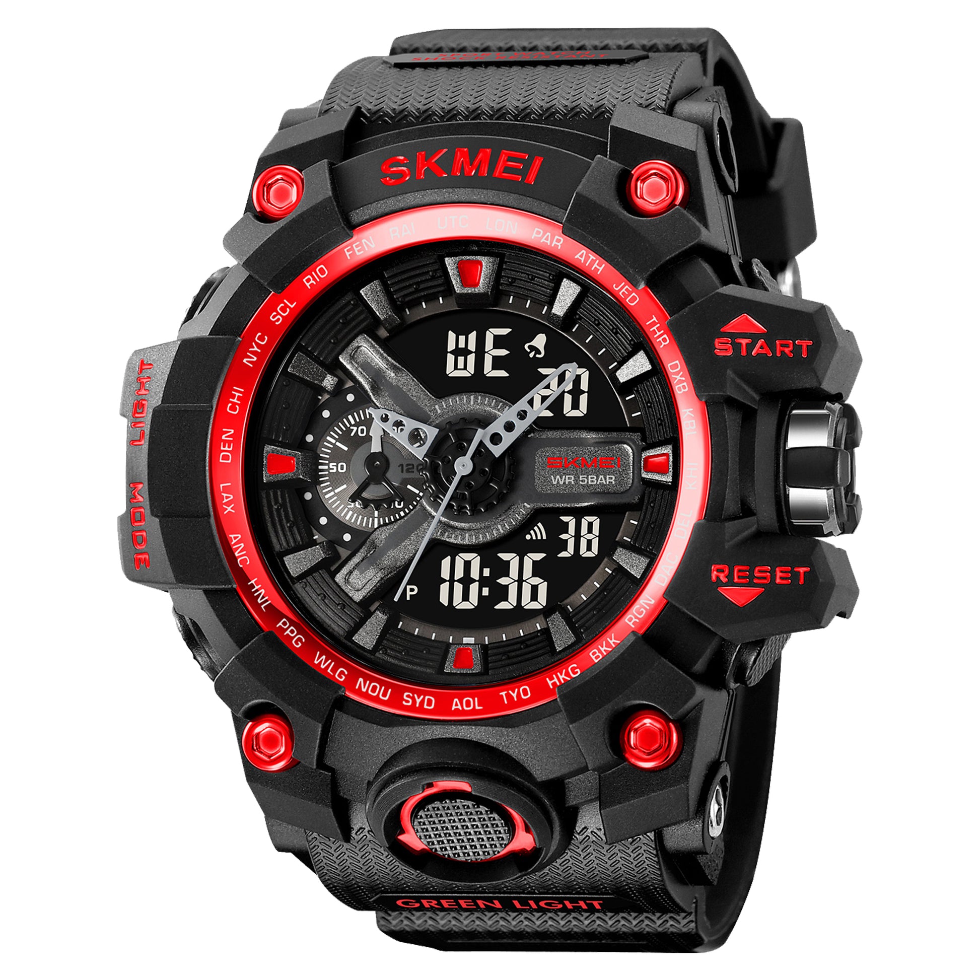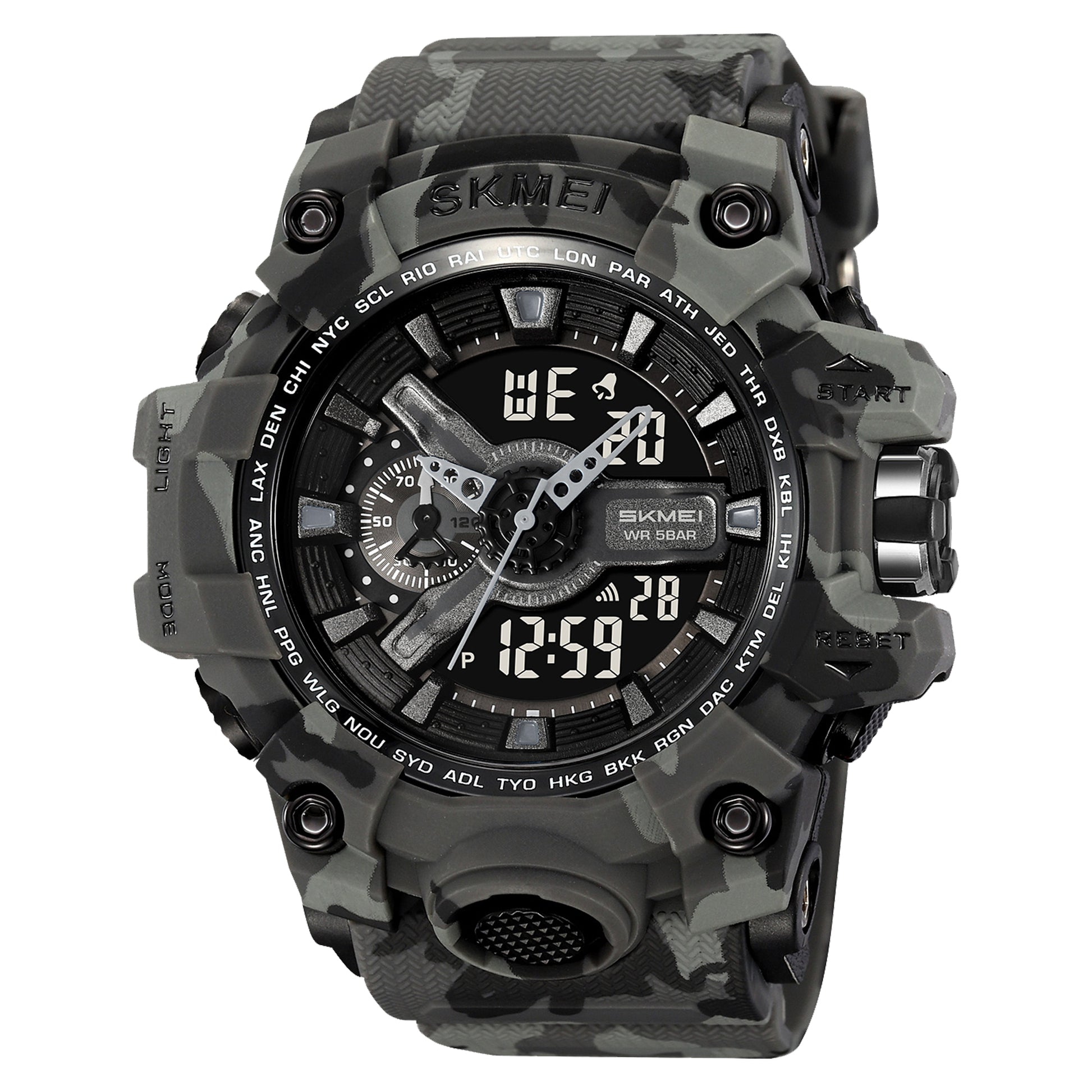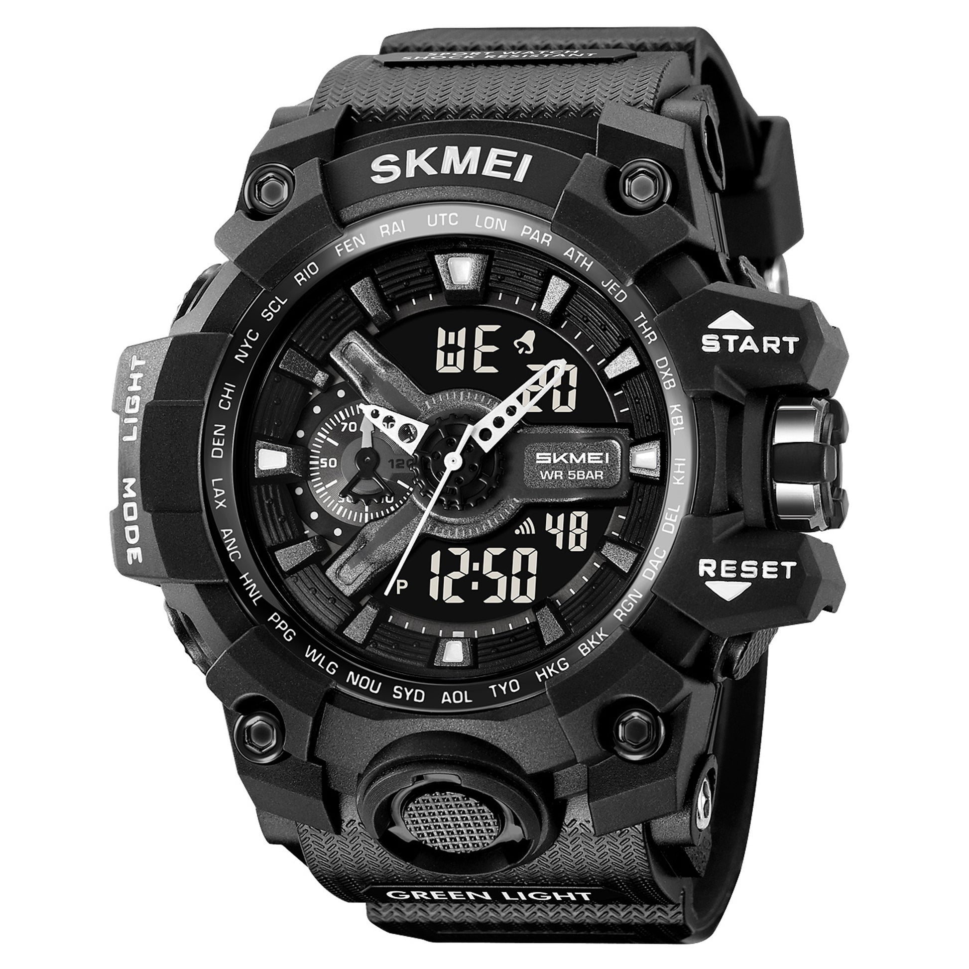 SKMEI Digital Sports Watch for Men   a perfect blend of military-grade durability, precision timekeeping, and modern features . Whether youre an outdoor enthusiast, athlete, or traveler , this shock-resistant digital watch  is designed for functionality and toughness . Made with a rugged ABSTPU case  and a scratch-resistant resin crystal , this military tactical watch  is tough enough for outdoor activities, gym workouts, and sports . With 50M (5 ATM) water resistance , its ideal for swimming, hiking, and rainy days . Precision Timekeeping & Multi-Function Features Stay ahead of your schedule with dual time zones, chronograph stopwatch, alarm, and 12/24-hour format . This sports watch waterproof design  ensures you never miss an important moment . Designed for day and night use , the LED backlight display  makes it easy to read the time in the dark perfect for campers, night runners, or travelers. Lightweight, Comfortable & Adjustable Fit Weighing just 73.3g , this best digital watch for men  offers a lightweight, comfortable fit , with a 260mm strap that adjusts easily  for all wrist sizes. Gift for Men Whether youre gifting a sports enthusiast, military-style watch lover, or outdoor adventurer , mens watch  is an ideal birthday, Christmas, or Fathers Day present .