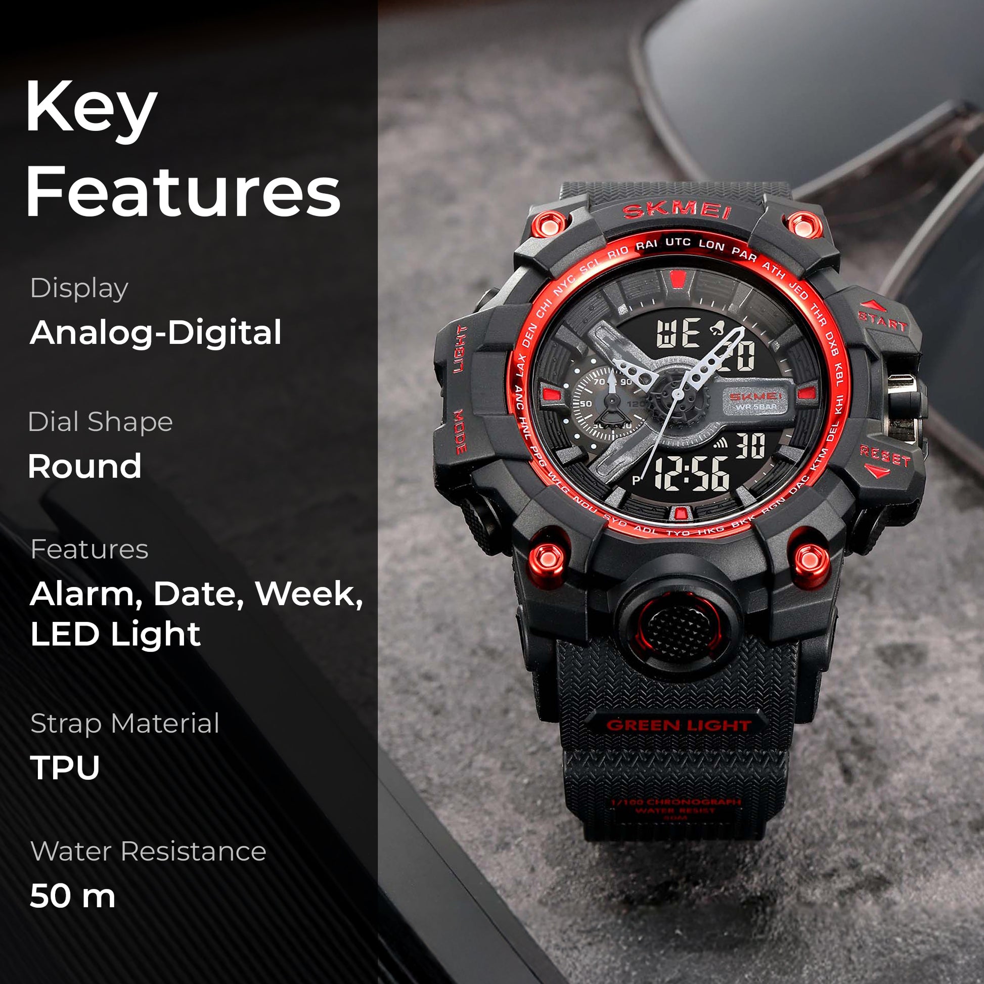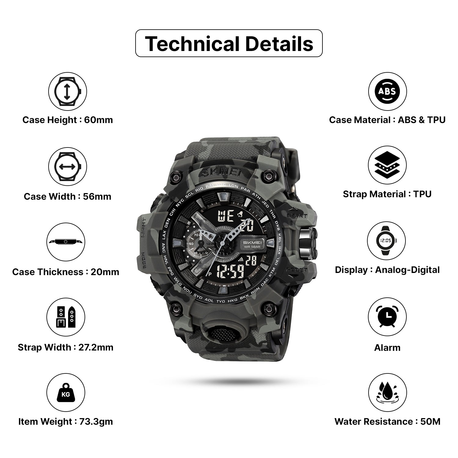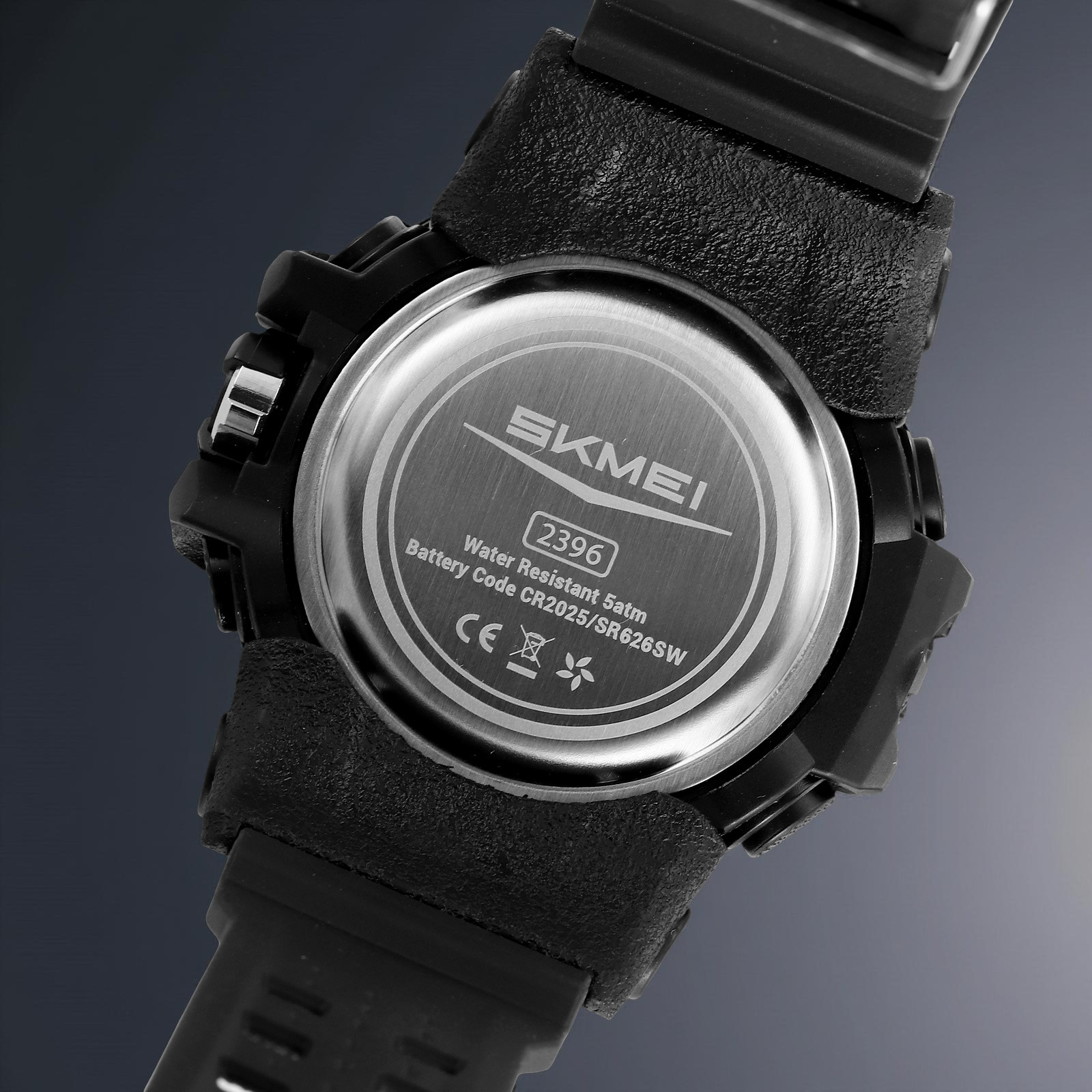 SKMEI Digital Sports Watch for Men   a perfect blend of military-grade durability, precision timekeeping, and modern features . Whether youre an outdoor enthusiast, athlete, or traveler , this shock-resistant digital watch  is designed for functionality and toughness . Made with a rugged ABSTPU case  and a scratch-resistant resin crystal , this military tactical watch  is tough enough for outdoor activities, gym workouts, and sports . With 50M (5 ATM) water resistance , its ideal for swimming, hiking, and rainy days . Precision Timekeeping & Multi-Function Features Stay ahead of your schedule with dual time zones, chronograph stopwatch, alarm, and 12/24-hour format . This sports watch waterproof design  ensures you never miss an important moment . Designed for day and night use , the LED backlight display  makes it easy to read the time in the dark perfect for campers, night runners, or travelers. Lightweight, Comfortable & Adjustable Fit Weighing just 73.3g , this best digital watch for men  offers a lightweight, comfortable fit , with a 260mm strap that adjusts easily  for all wrist sizes. Gift for Men Whether youre gifting a sports enthusiast, military-style watch lover, or outdoor adventurer , mens watch  is an ideal birthday, Christmas, or Fathers Day present .