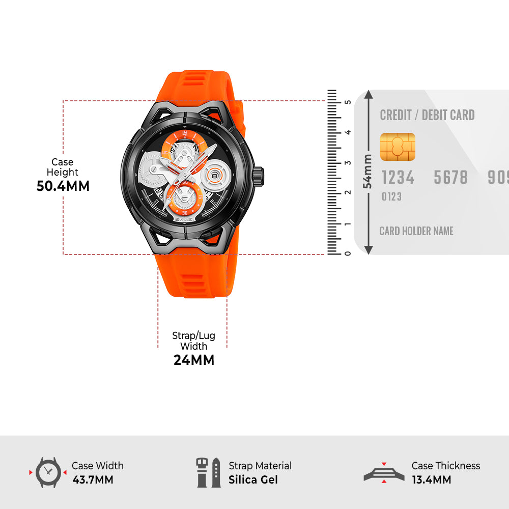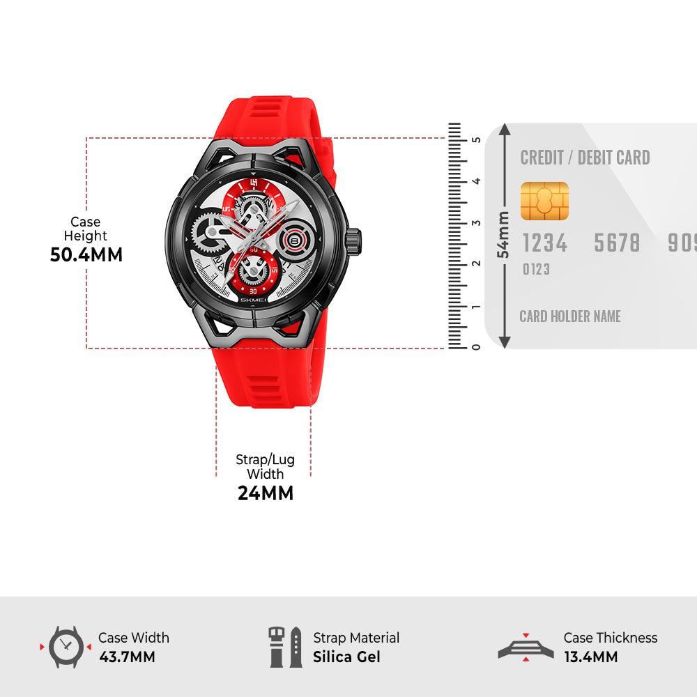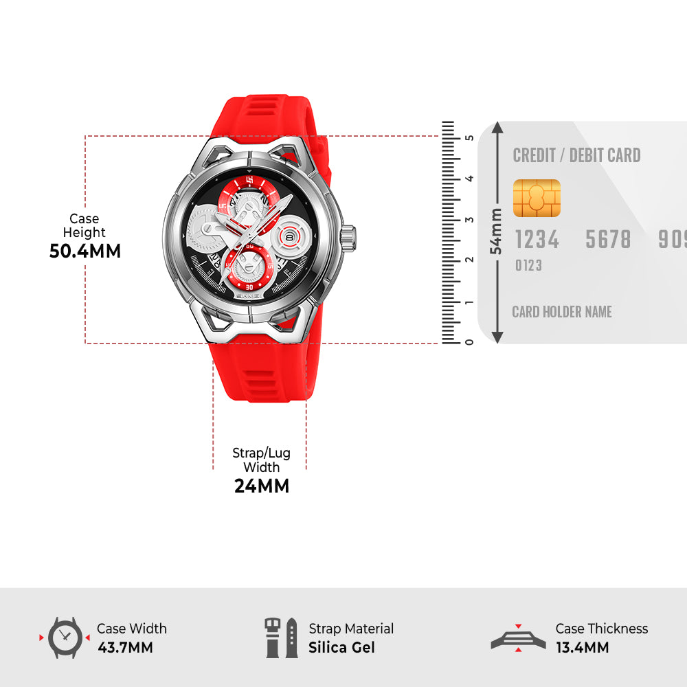 The SKMEI 9349 watch combines versatility and reliability, making it ideal for any occasion. It features a scratch-resistant glass for durability, a comfortable red silicone strap, and a stainless-steel buckle powered by quartz movement, with a zinc alloy case for long-lasting performance.