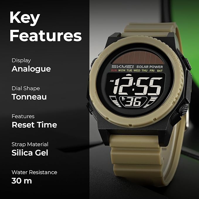 Upgrade your outdoor experience with the SKMEI 2358 Solar Digital Watch , designed for durability, reliability, and efficiency. Featuring solar power technology , this watch reduces battery dependence while ensuring consistent performance. Built with a 50M waterproof rating , it withstands water splashes, rain, and swimming, making it perfect for both adventure seekers and daily wear. The multi-functional display includes a stopwatch, alarm, date, week indicator, and 12/24-hour time formats, providing all essential features in one stylish piece. Designed with a rugged military-style case , a flexible TPU strap , and a strong stainless steel back cover , the SKMEI 2358 offers comfort and long-lasting wear. Whether youre hiking, training, or just looking for a reliable sports watch, this model delivers a powerful combination of style, functionality, and durability .